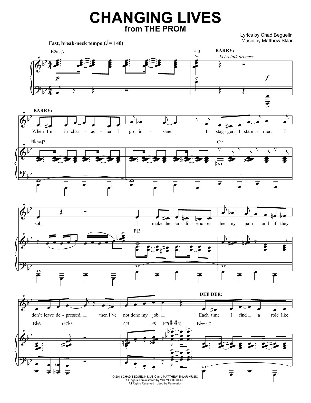 Download or print Matthew Sklar & Chad Beguelin Changing Lives (from The Prom: A New Musical) sheet music, chords and digital score arranged for Piano & Vocal. This Film/TV score includes 6 page(s).
