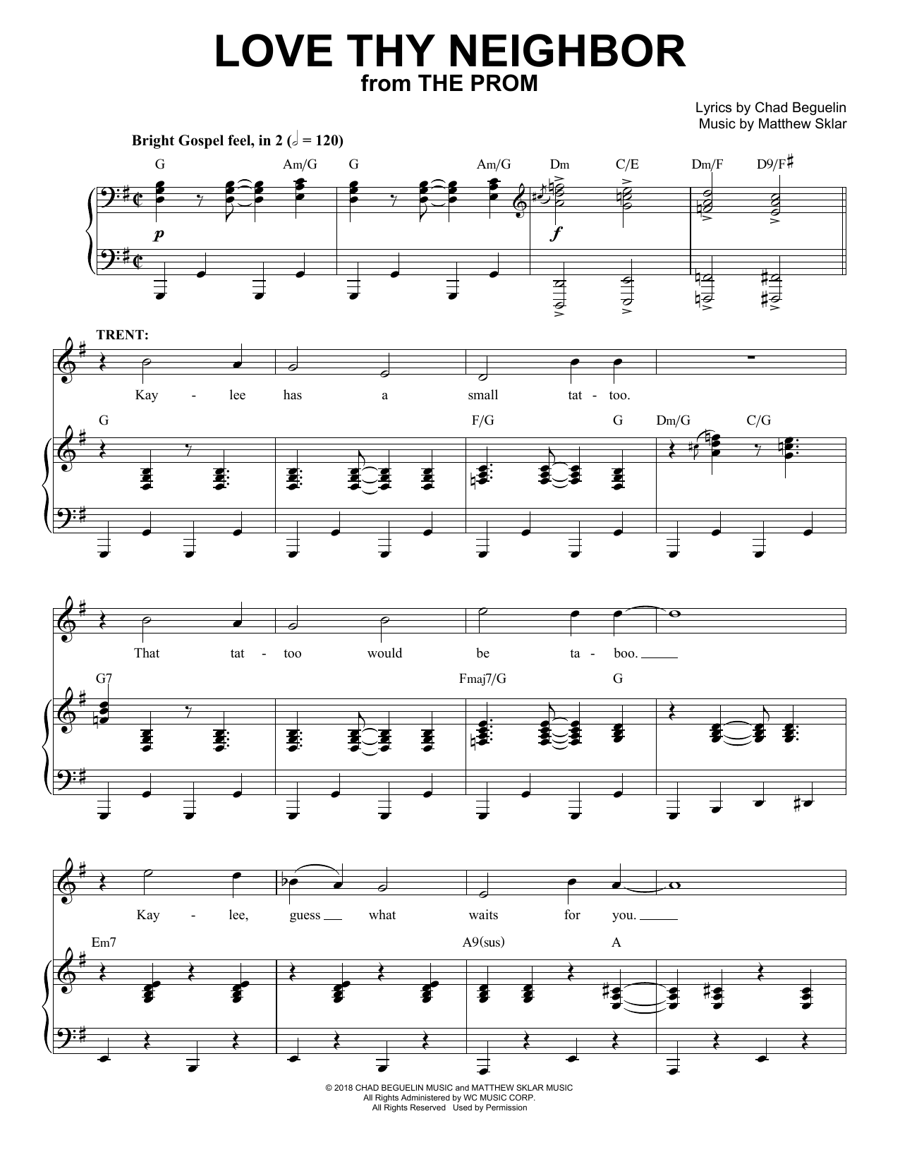 Download or print Matthew Sklar & Chad Beguelin Love Thy Neighbor (from The Prom: A New Musical) sheet music, chords and digital score arranged for Piano & Vocal. This Film/TV score includes 15 page(s).