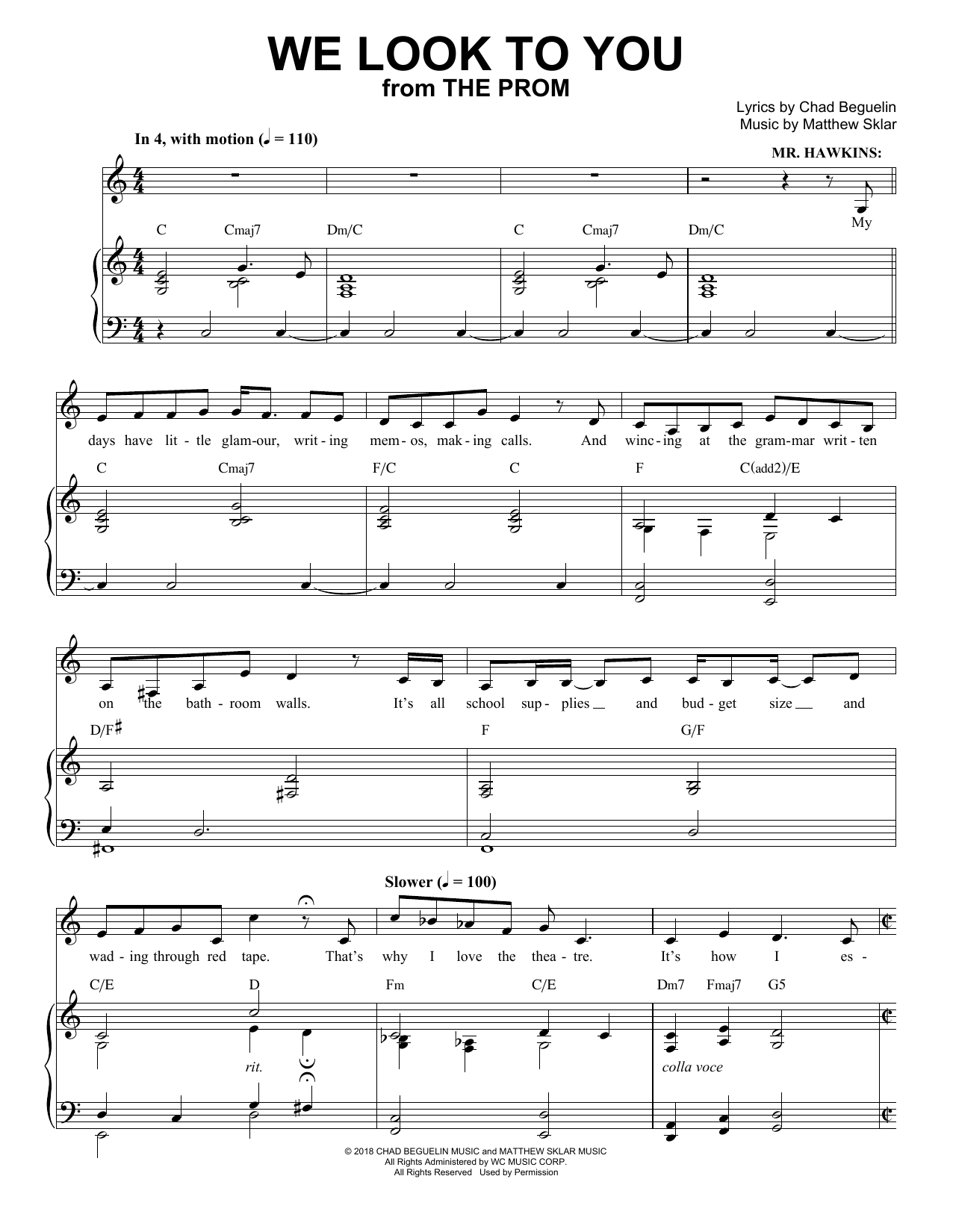 Download or print Matthew Sklar & Chad Beguelin We Look To You (from The Prom: A New Musical) sheet music, chords and digital score arranged for Piano & Vocal. This Film/TV score includes 6 page(s).