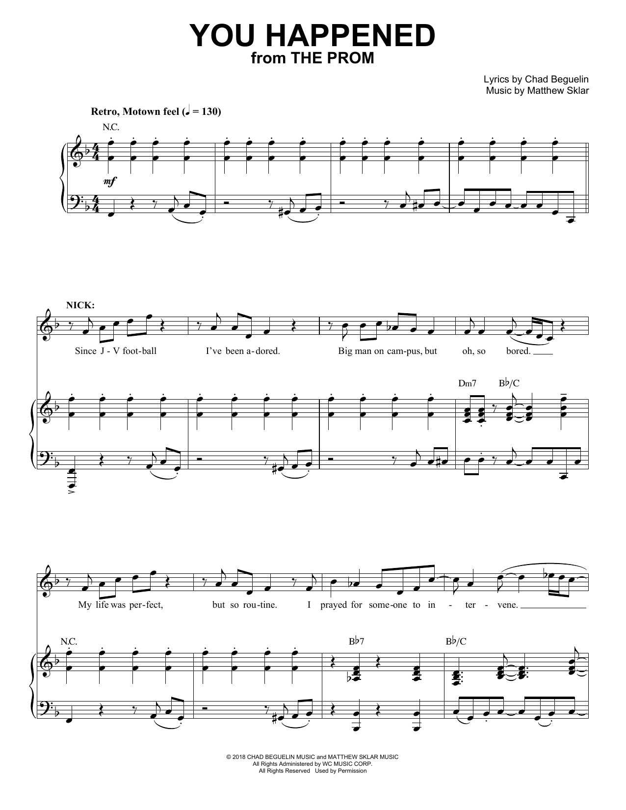 Download or print Matthew Sklar & Chad Beguelin You Happened (from The Prom: A New Musical) sheet music, chords and digital score arranged for Piano & Vocal. This Film/TV score includes 7 page(s).