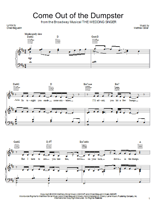 Download or print Matthew Sklar Come Out Of The Dumpster sheet music, chords and digital score arranged for Piano, Vocal & Guitar Chords (Right-Hand Melody). This Musical/Show score includes 7 page(s).