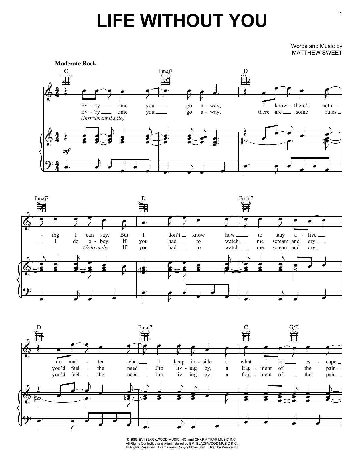 Download or print Matthew Sweet Life Without You sheet music, chords and digital score arranged for Piano, Vocal & Guitar Chords (Right-Hand Melody). This Rock score includes 2 page(s).