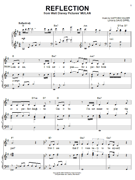 Download or print Matthew Wilder & David Zippel Reflection (from Mulan) sheet music, chords and digital score arranged for Flute and Piano. This Disney score includes 3 page(s).