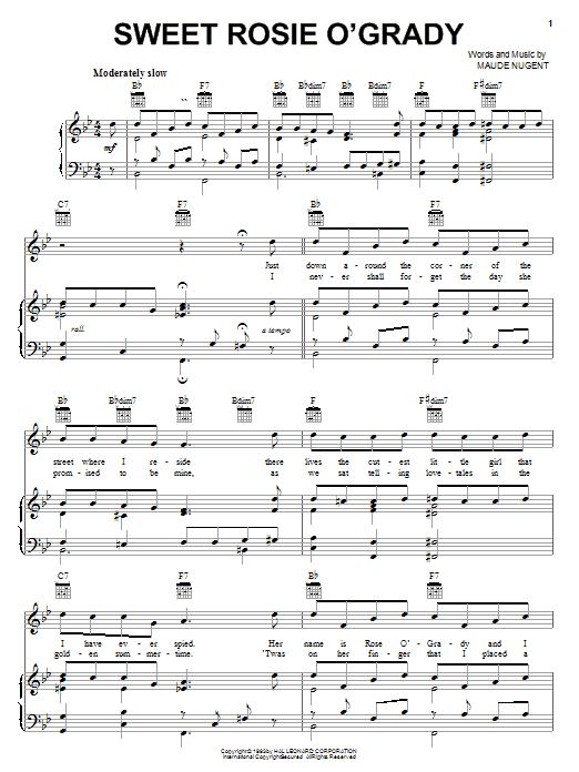 Download or print Maude Nugent Sweet Rosie O'Grady sheet music, chords and digital score arranged for Big Note Piano. This Folk score includes 2 page(s).