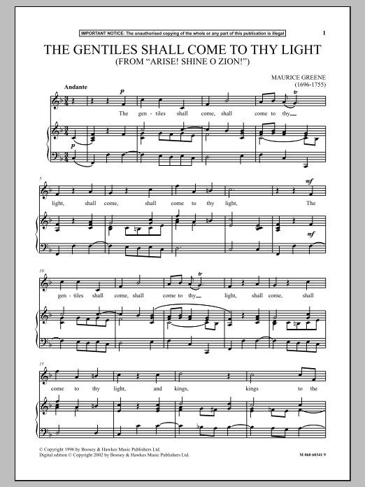 Download or print Maurice Greene The Gentiles Shall Come To Thy Light (from Arise! Shine O Zion!) sheet music, chords and digital score arranged for Piano & Vocal. This Classical score includes 2 page(s).