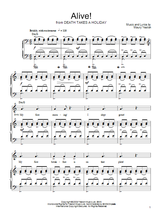 Download or print Maury Yeston Alive! sheet music, chords and digital score arranged for Piano, Vocal & Guitar Chords (Right-Hand Melody). This Musical/Show score includes 10 page(s).