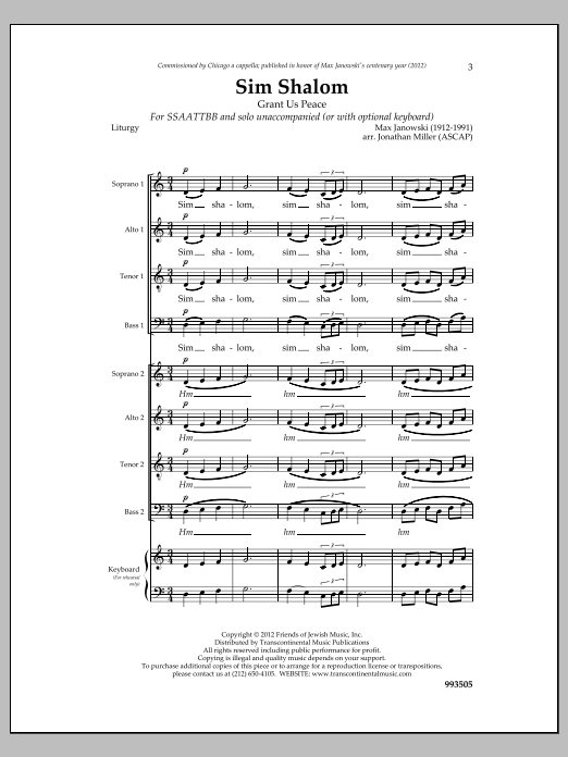 Download or print Max Janowski Sim Shalom sheet music, chords and digital score arranged for SSAATTBB Choir. This Sacred score includes 22 page(s).