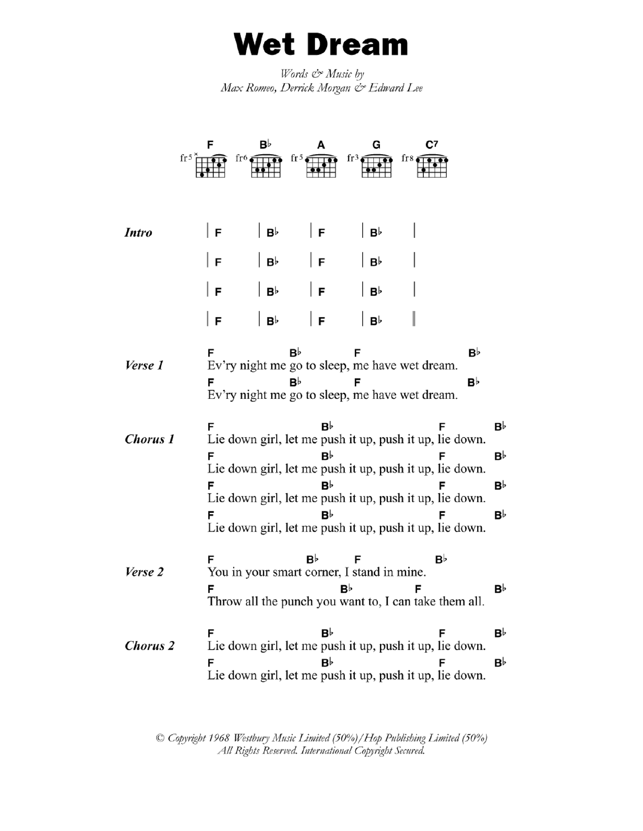 Download or print Max Romeo Wet Dream sheet music, chords and digital score arranged for Guitar Chords/Lyrics. This Reggae score includes 2 page(s).