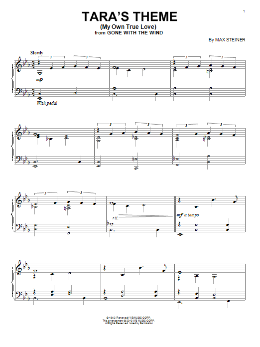 Download or print Max Steiner Tara's Theme (My Own True Love) sheet music, chords and digital score arranged for Piano Solo. This Standards score includes 5 page(s).
