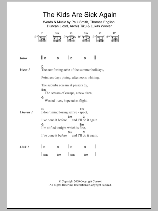 Download or print Maximo Park The Kids Are Sick Again sheet music, chords and digital score arranged for Guitar Chords/Lyrics. This Rock score includes 2 page(s).