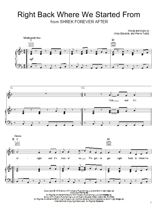 Download or print Maxine Nightingale Right Back Where We Started From sheet music, chords and digital score arranged for Piano, Vocal & Guitar Chords (Right-Hand Melody). This Film/TV score includes 4 page(s).