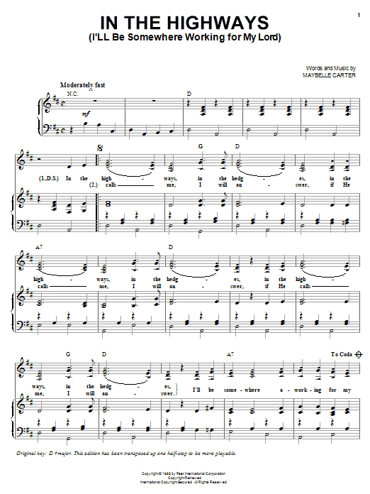 Download or print Maybelle Carter In The Highways (I'll Be Somewhere Working For My Lord) sheet music, chords and digital score arranged for Easy Piano. This Country score includes 3 page(s).