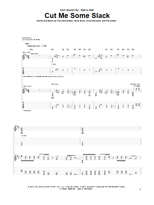 Download or print McCartney, Grohl, Novoselic, Smear Cut Me Some Slack sheet music, chords and digital score arranged for Piano, Vocal & Guitar Chords (Right-Hand Melody). This Pop score includes 12 page(s).