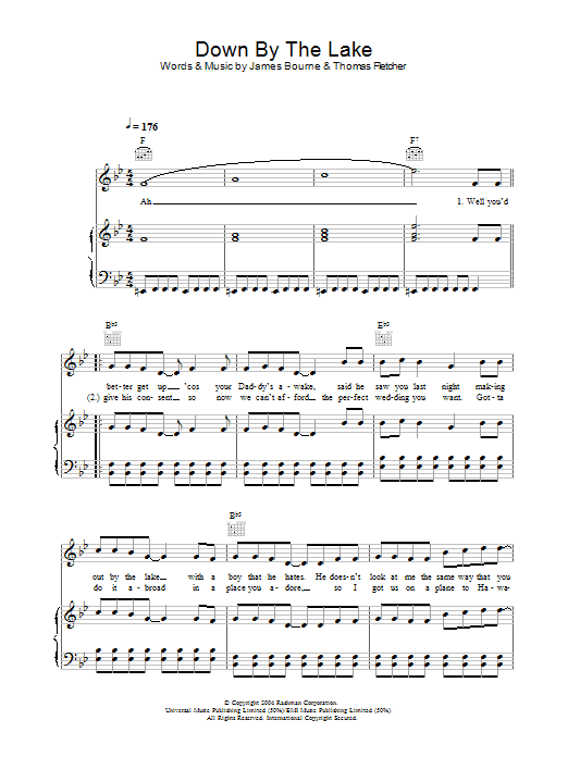 Download or print McFly Down By The Lake sheet music, chords and digital score arranged for Piano, Vocal & Guitar Chords. This Pop score includes 5 page(s).