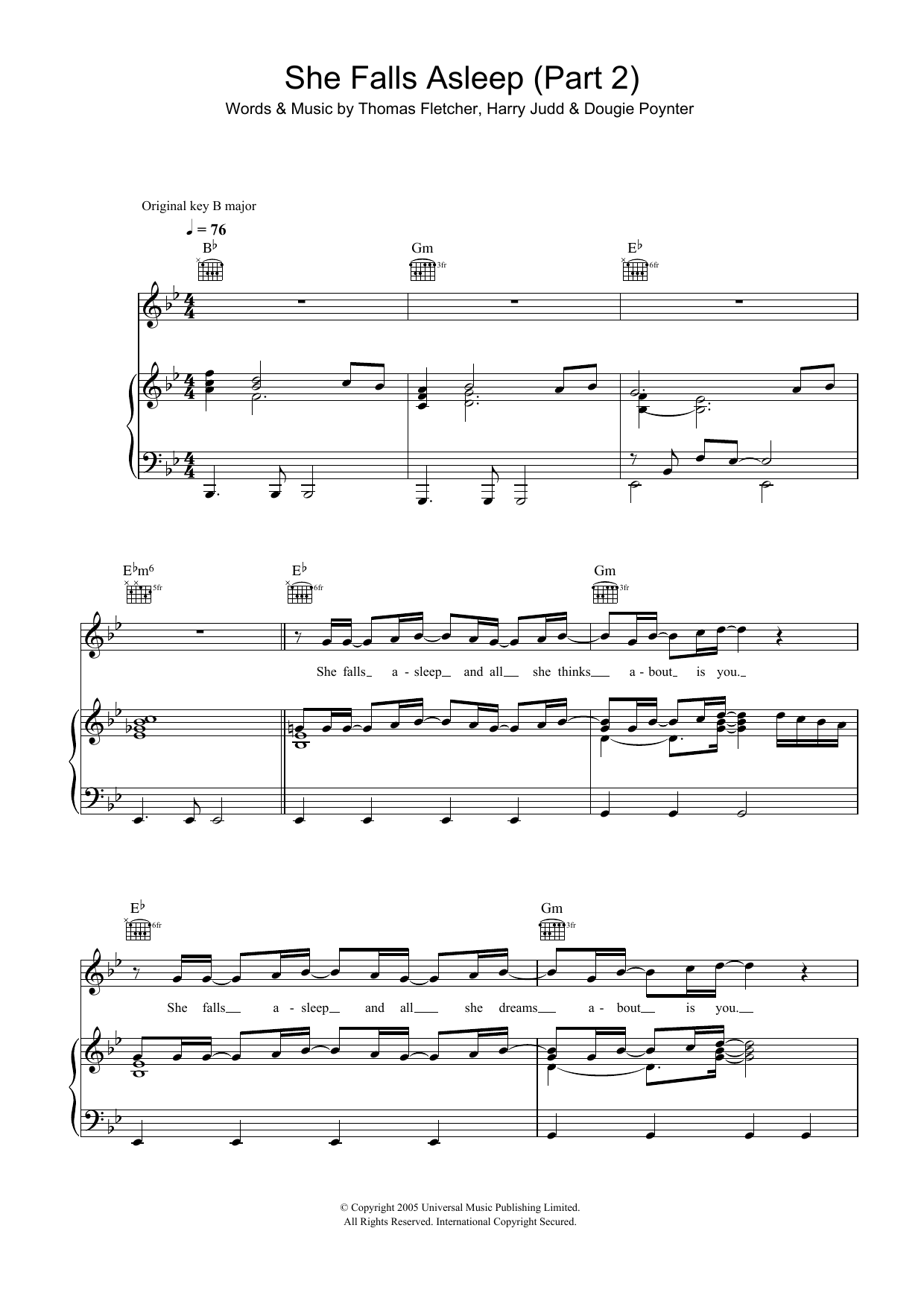 Download or print McFly She Falls Asleep Part 2 sheet music, chords and digital score arranged for Piano, Vocal & Guitar Chords. This Pop score includes 8 page(s).