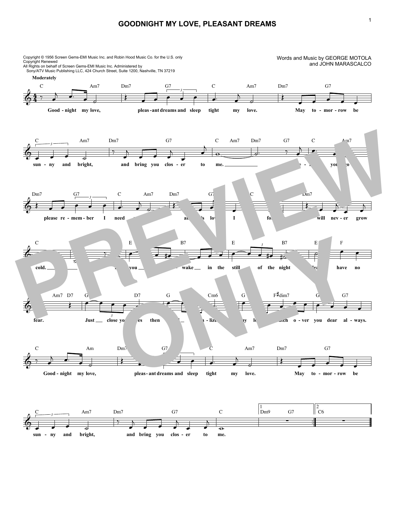 Download or print McGuire Sisters Goodnight My Love, Pleasant Dreams sheet music, chords and digital score arranged for Lead Sheet / Fake Book. This Love score includes 1 page(s).