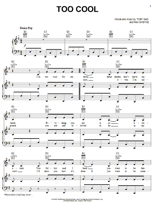 Download or print Meaghan Martin Too Cool sheet music, chords and digital score arranged for Piano, Vocal & Guitar Chords (Right-Hand Melody). This Disney score includes 6 page(s).