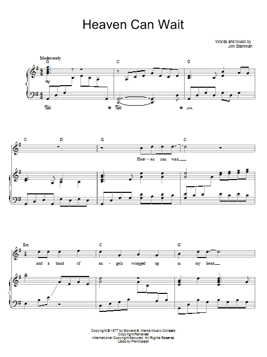 Download or print Meat Loaf Heaven Can Wait sheet music, chords and digital score arranged for Piano, Vocal & Guitar Chords (Right-Hand Melody). This Pop score includes 11 page(s).