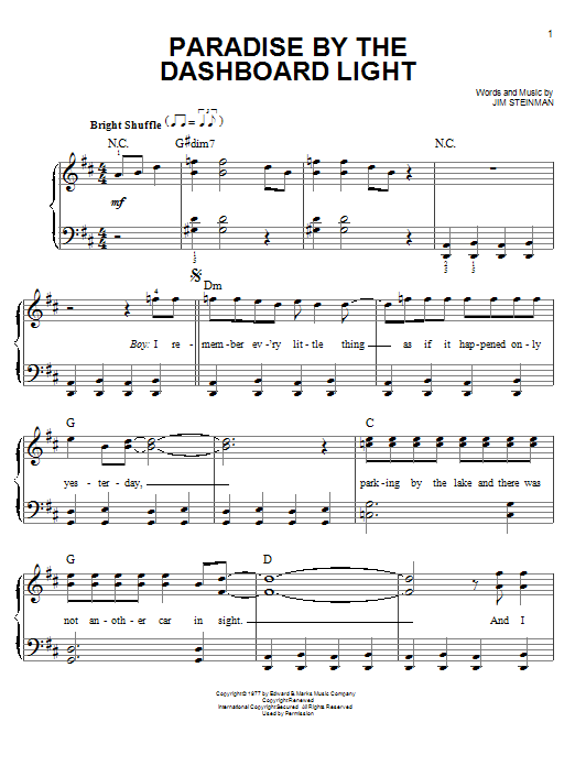 Download or print Meatloaf Paradise By The Dashboard Light sheet music, chords and digital score arranged for Lead Sheet / Fake Book. This Pop score includes 4 page(s).