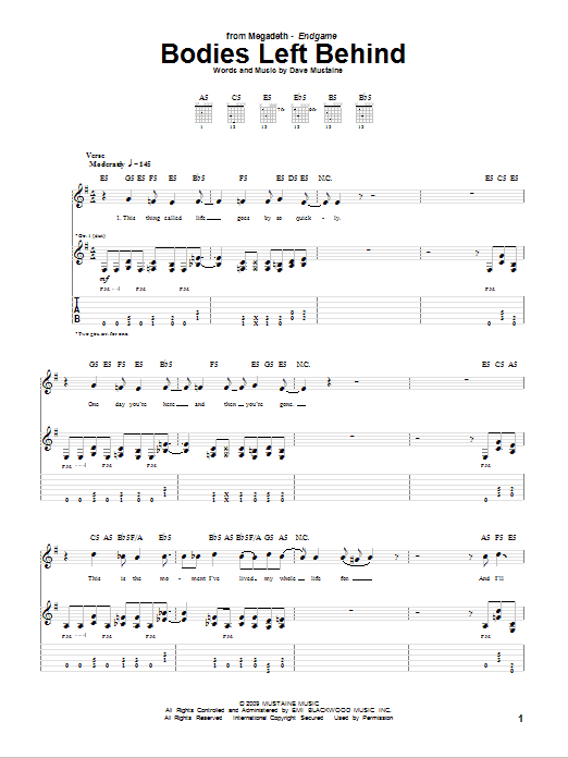 Download or print Megadeth Bodies Left Behind sheet music, chords and digital score arranged for Guitar Tab. This Metal score includes 11 page(s).