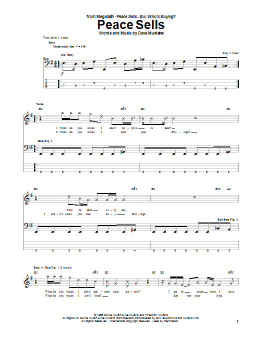 Download or print Megadeth Peace Sells sheet music, chords and digital score arranged for Bass Guitar Tab. This Metal score includes 8 page(s).