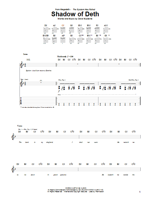 Download or print Megadeth Shadow Of Deth sheet music, chords and digital score arranged for Guitar Tab. This Metal score includes 5 page(s).