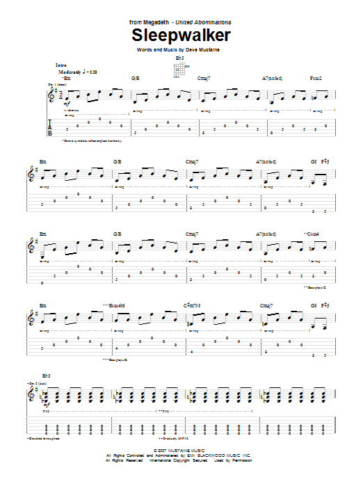 Download or print Megadeth Sleepwalker sheet music, chords and digital score arranged for Guitar Tab. This Metal score includes 11 page(s).