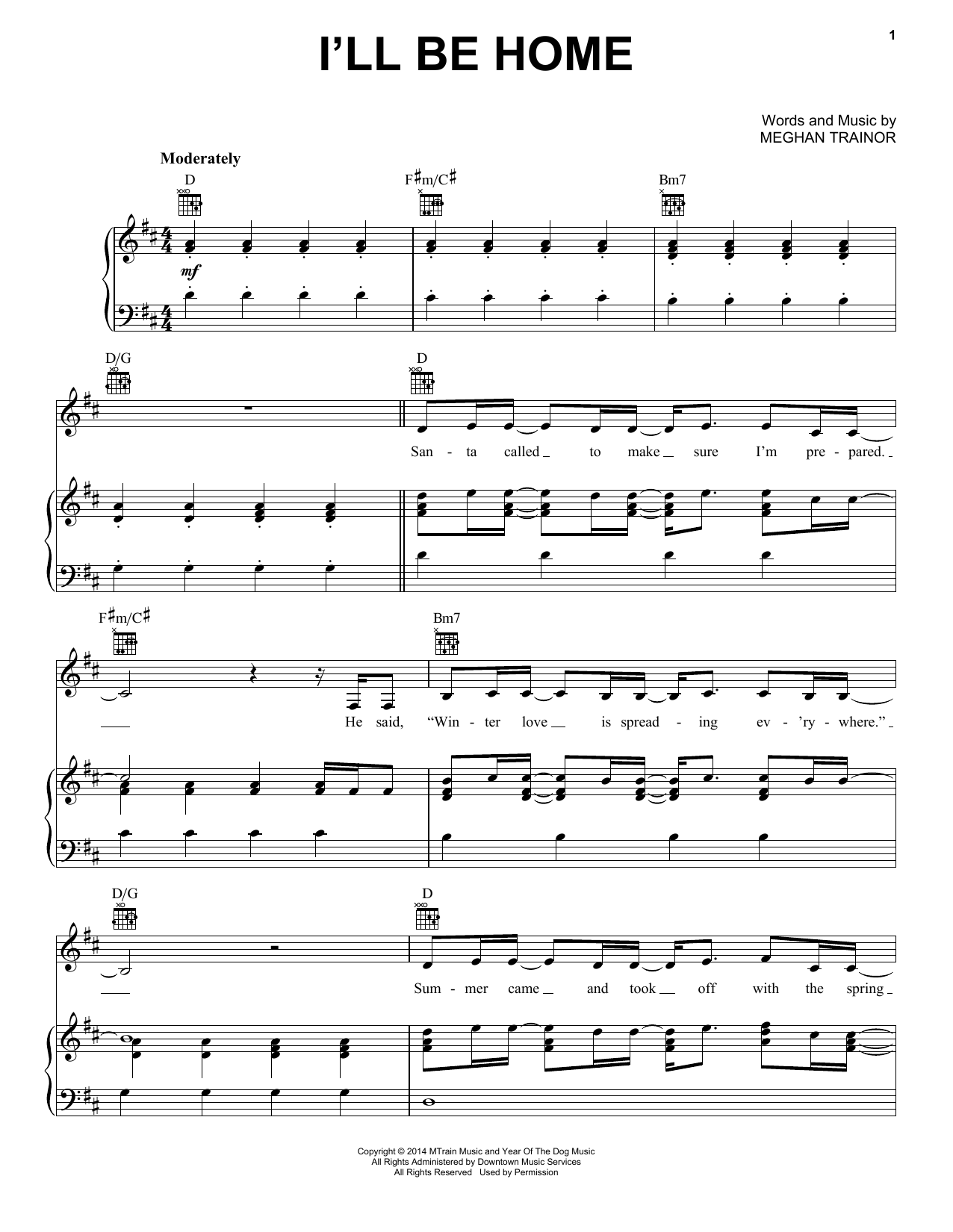 Download or print Meghan Trainor I'll Be Home sheet music, chords and digital score arranged for Piano, Vocal & Guitar Chords (Right-Hand Melody). This Christmas score includes 7 page(s).