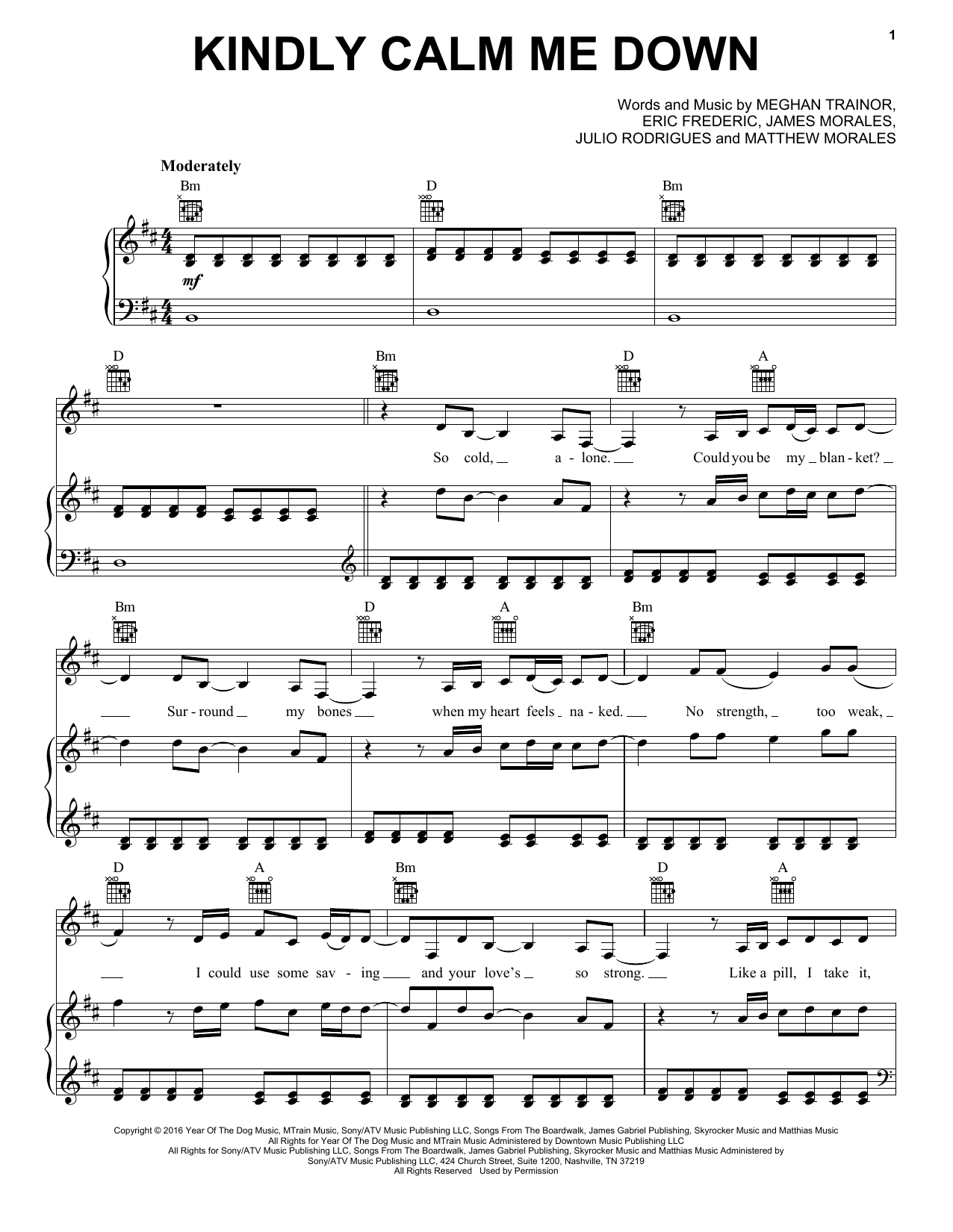 Download or print Meghan Trainor Kindly Calm Me Down sheet music, chords and digital score arranged for Piano, Vocal & Guitar Chords (Right-Hand Melody). This Pop score includes 6 page(s).