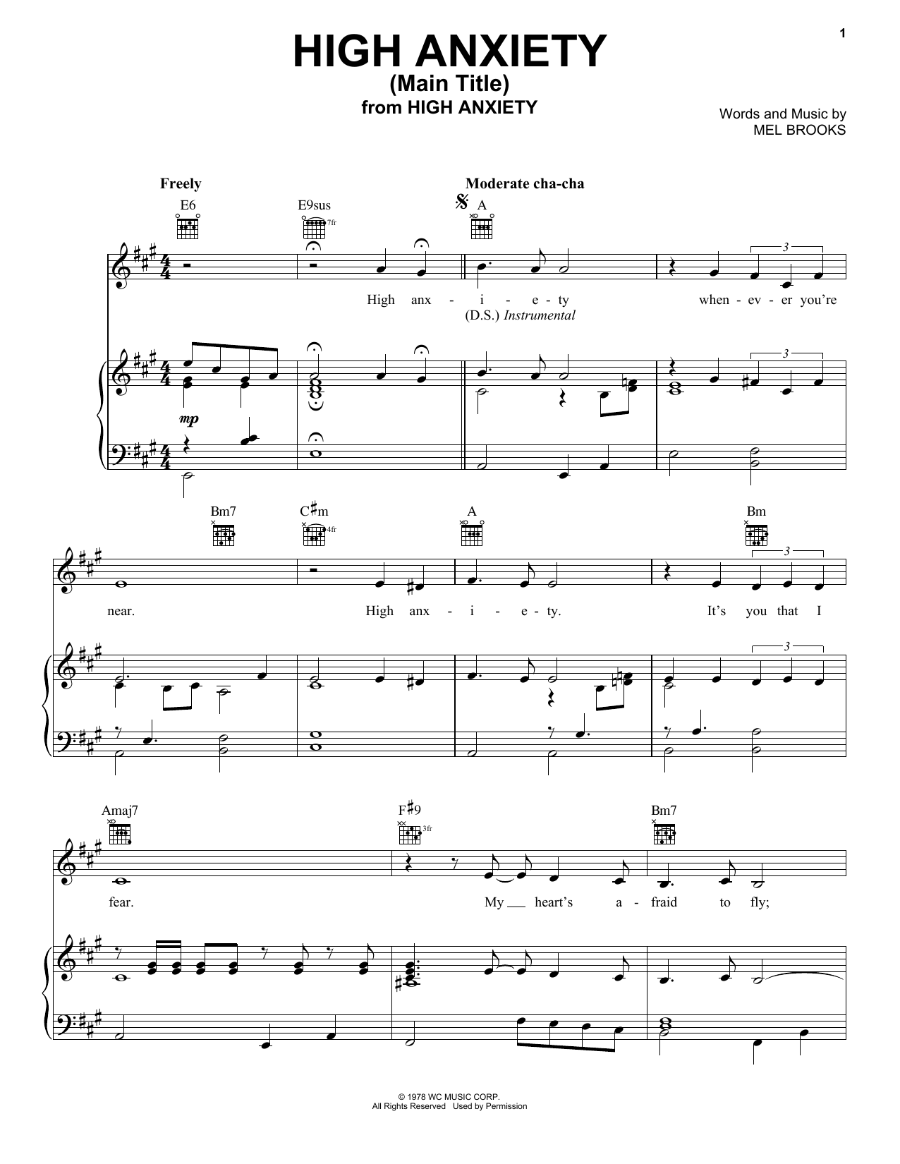 Download or print Mel Brooks High Anxiety (Main Title) (from High Anxiety) sheet music, chords and digital score arranged for Piano, Vocal & Guitar Chords (Right-Hand Melody). This Film/TV score includes 4 page(s).