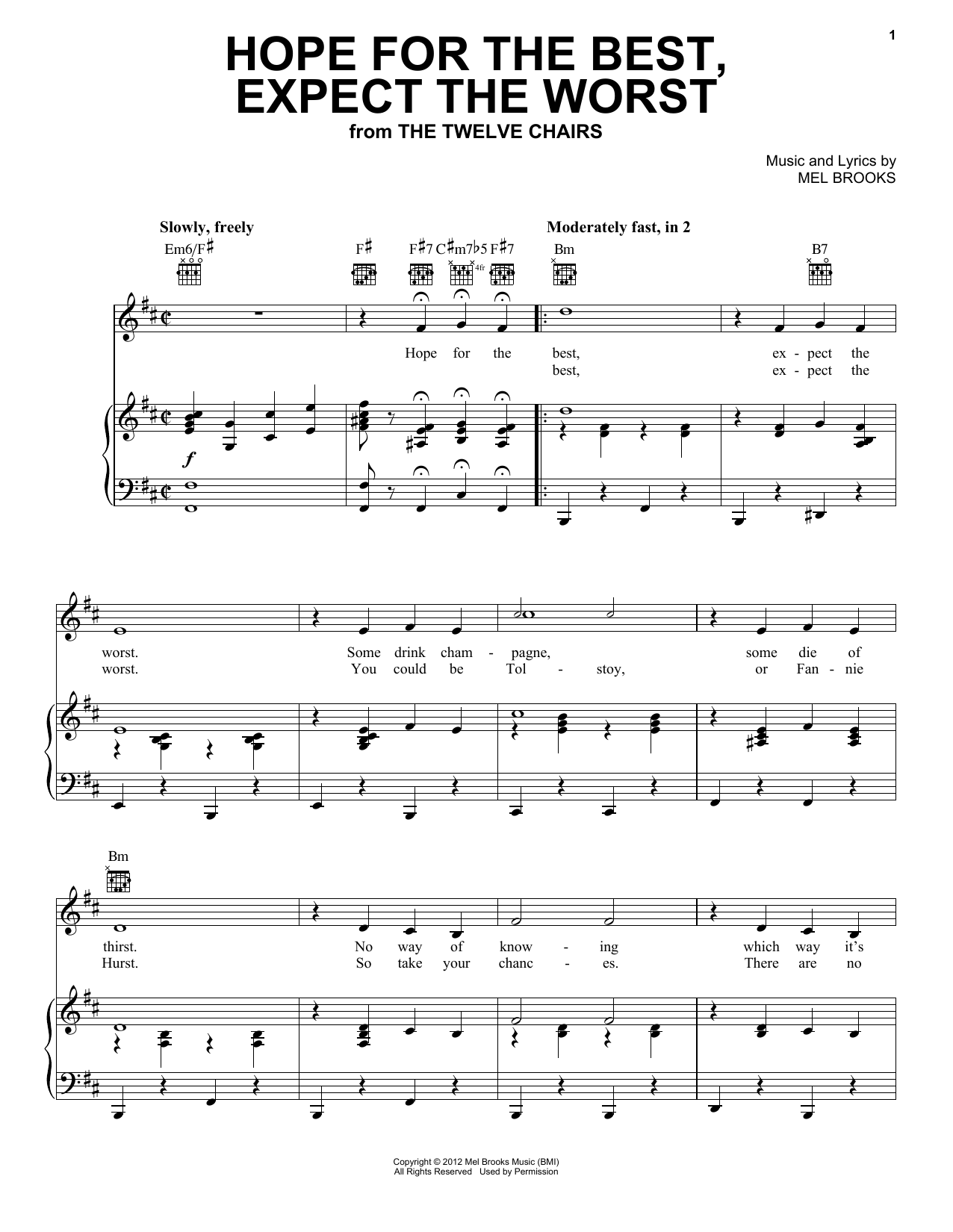 Download or print Mel Brooks Hope For The Best, Expect The Worst (from The Twelve Chairs) sheet music, chords and digital score arranged for Piano, Vocal & Guitar Chords (Right-Hand Melody). This Film/TV score includes 5 page(s).