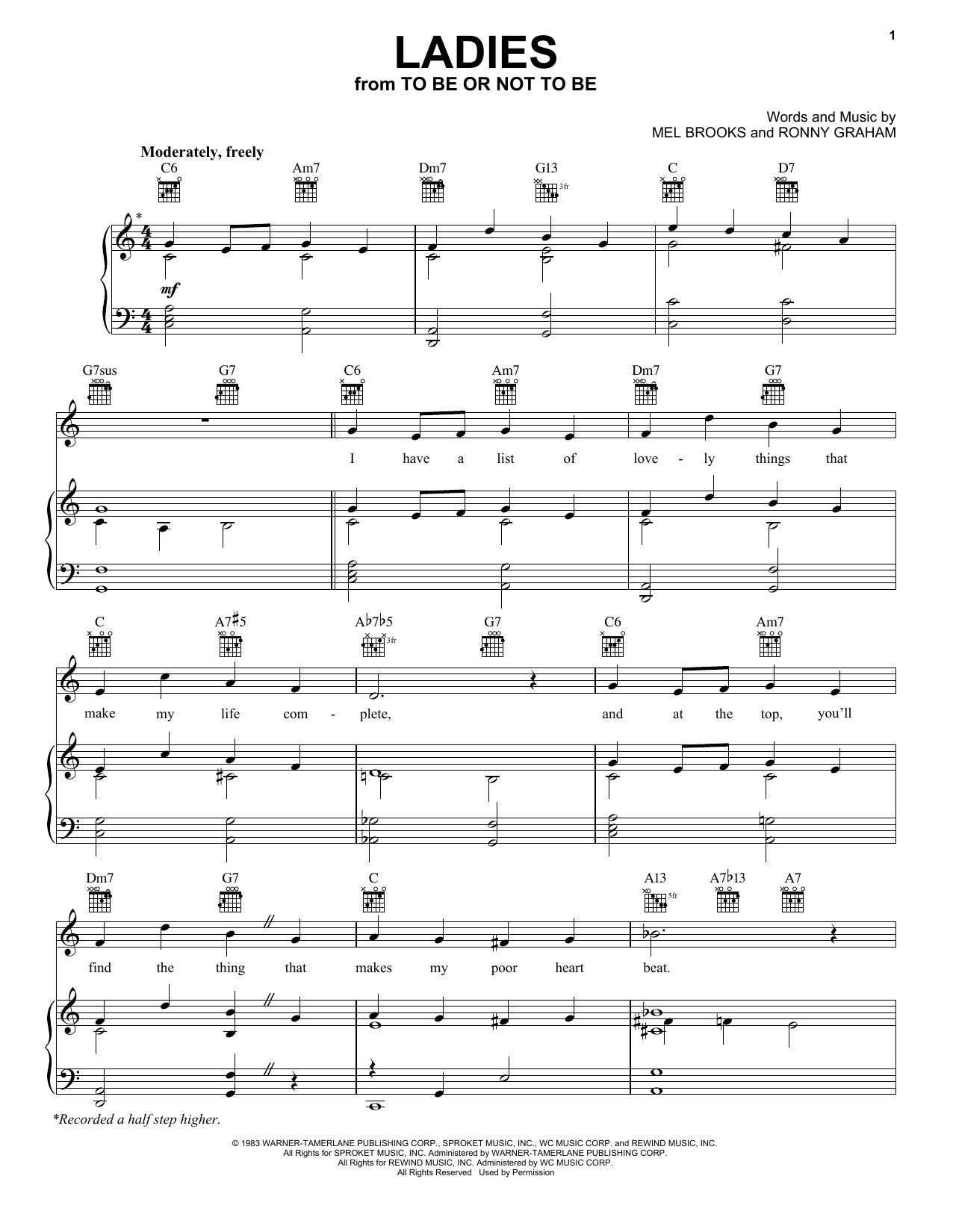 Download or print Mel Brooks Ladies (from To Be Or Not To Be) sheet music, chords and digital score arranged for Piano, Vocal & Guitar Chords (Right-Hand Melody). This Film/TV score includes 8 page(s).