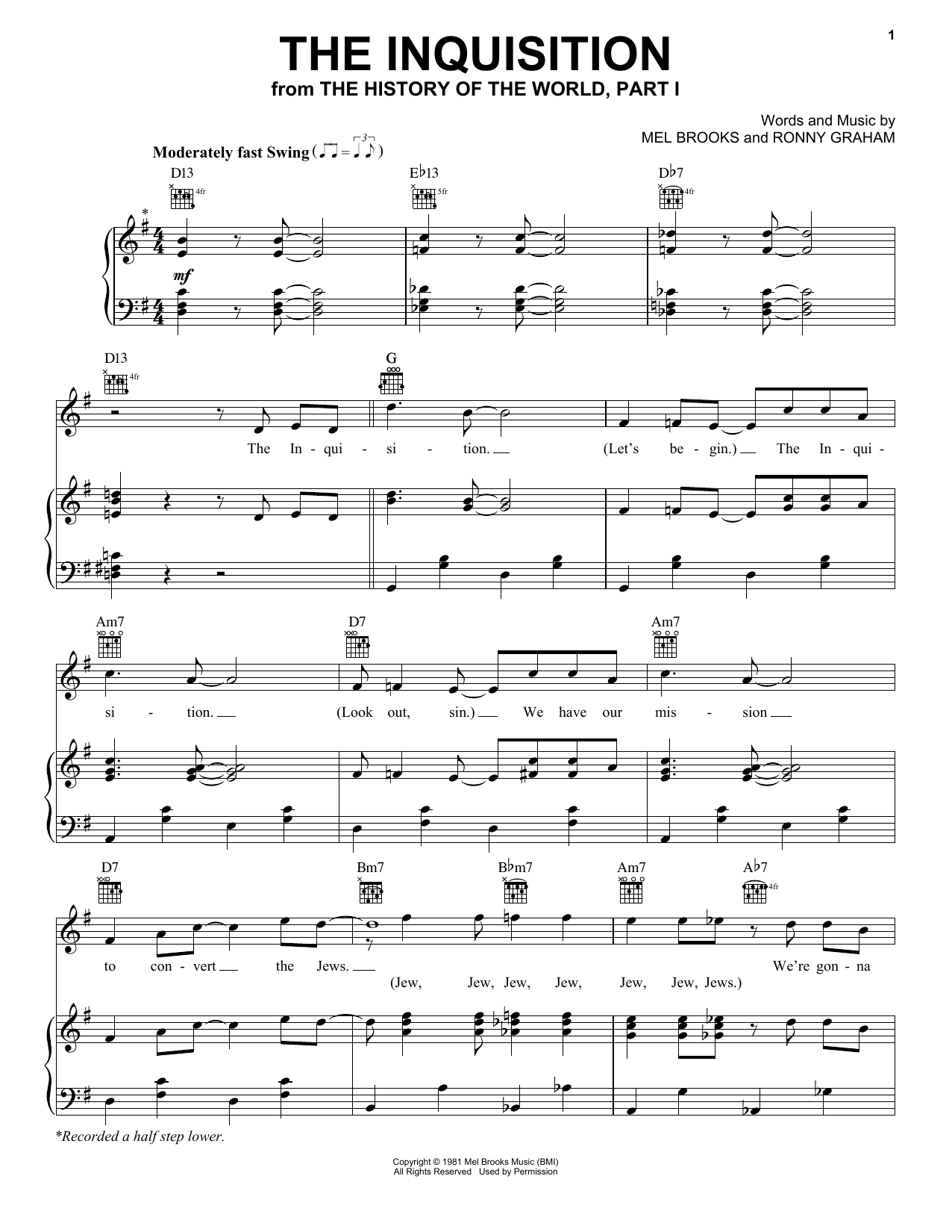 Download or print Mel Brooks The Inquisition (from The History Of The World, Part I) sheet music, chords and digital score arranged for Piano, Vocal & Guitar Chords (Right-Hand Melody). This Film/TV score includes 13 page(s).