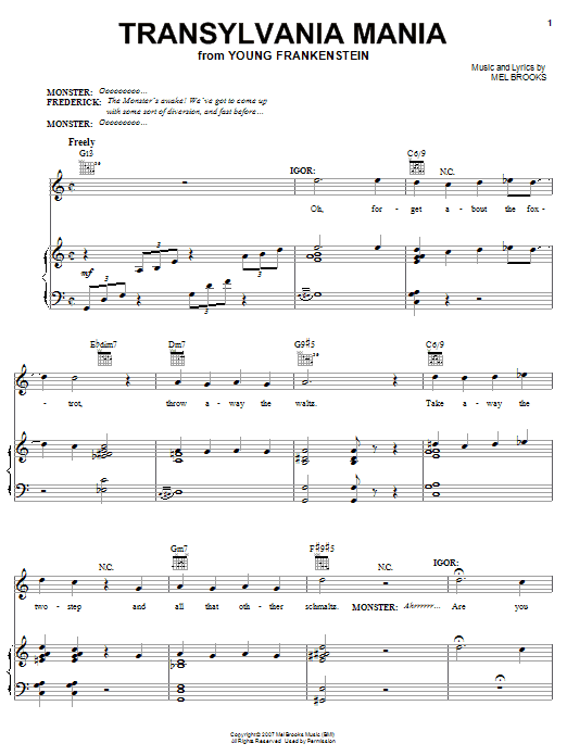 Download or print Mel Brooks Transylvania Mania sheet music, chords and digital score arranged for Lead Sheet / Fake Book. This Musical/Show score includes 2 page(s).