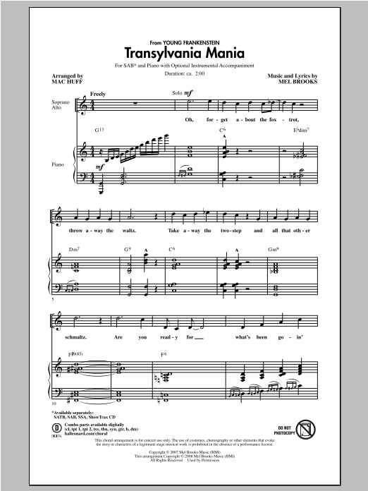 Download or print Mac Huff Transylvania Mania sheet music, chords and digital score arranged for SAB Choir. This Broadway score includes 15 page(s).