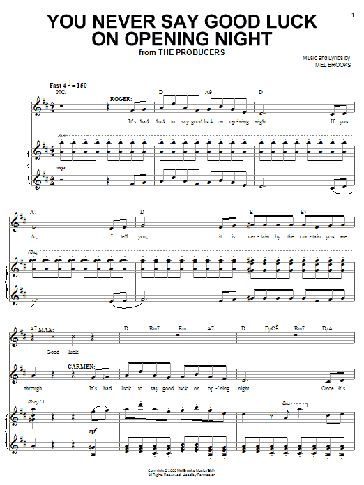 Download or print Mel Brooks You Never Say Good Luck On Opening Night sheet music, chords and digital score arranged for Piano & Vocal. This Musical/Show score includes 6 page(s).