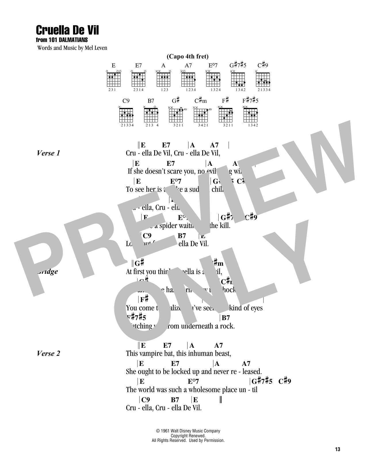 Download or print Mel Leven Cruella De Vil (from 101 Dalmatians) sheet music, chords and digital score arranged for Guitar Chords/Lyrics. This Disney score includes 1 page(s).