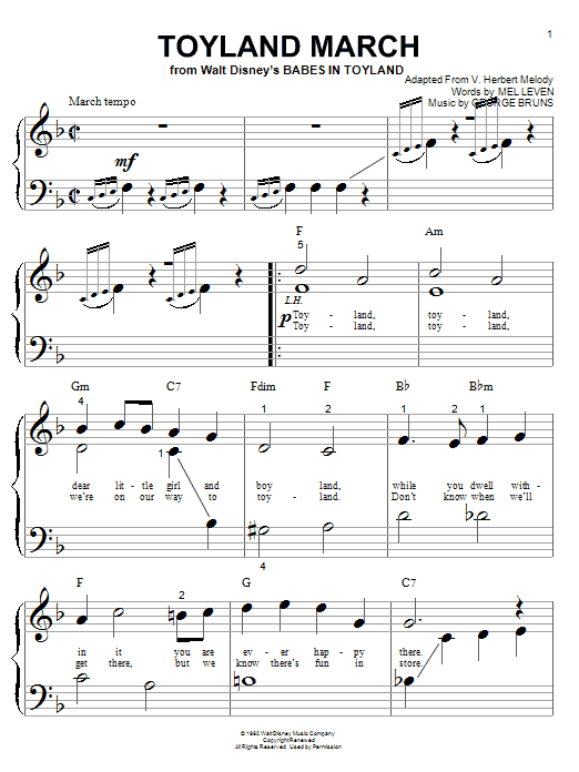 Download or print George Bruns & Mel Leven Toyland March (from Babes In Toyland) sheet music, chords and digital score arranged for French Horn Solo. This Children score includes 1 page(s).