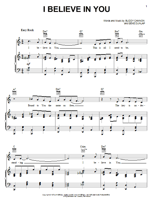 Download or print Mel Tillis I Believe In You sheet music, chords and digital score arranged for Piano, Vocal & Guitar Chords (Right-Hand Melody). This Country score includes 3 page(s).