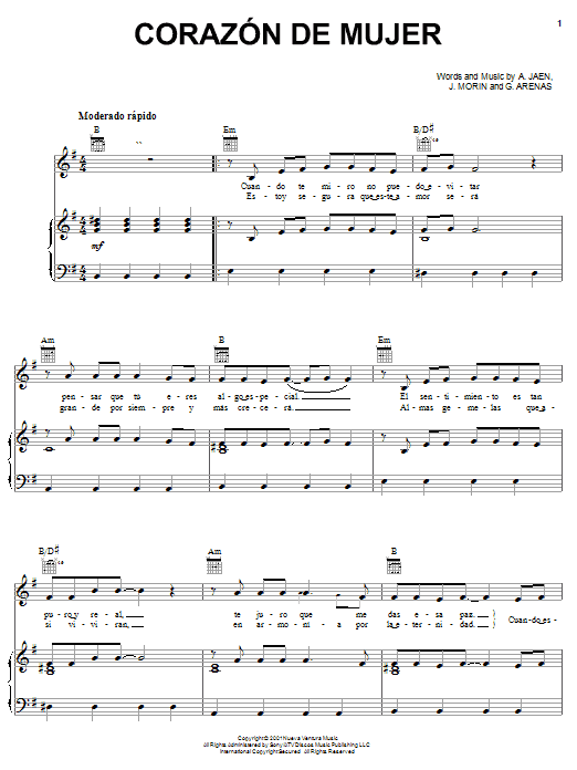 Download or print Melina Leon Corazon De Mujer sheet music, chords and digital score arranged for Piano, Vocal & Guitar Chords (Right-Hand Melody). This Latin score includes 7 page(s).