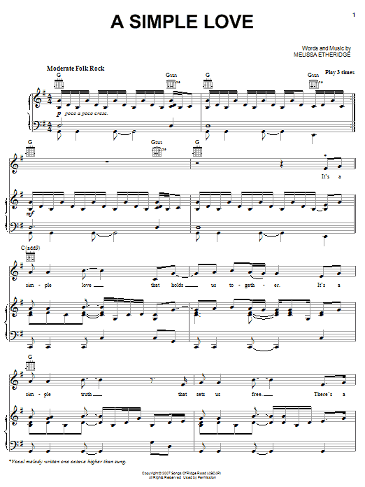 Download or print Melissa Etheridge A Simple Love sheet music, chords and digital score arranged for Piano, Vocal & Guitar Chords (Right-Hand Melody). This Pop score includes 2 page(s).