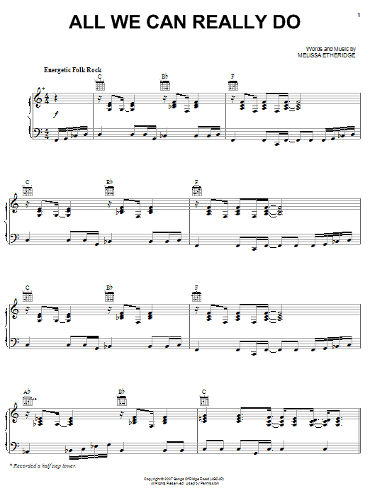 Download or print Melissa Etheridge All We Can Really Do sheet music, chords and digital score arranged for Piano, Vocal & Guitar Chords (Right-Hand Melody). This Pop score includes 2 page(s).