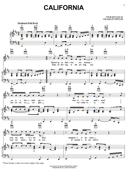 Download or print Melissa Etheridge California sheet music, chords and digital score arranged for Piano, Vocal & Guitar Chords (Right-Hand Melody). This Pop score includes 5 page(s).