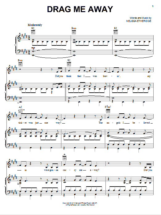 Download or print Melissa Etheridge Drag Me Away sheet music, chords and digital score arranged for Piano, Vocal & Guitar Chords (Right-Hand Melody). This Pop score includes 10 page(s).