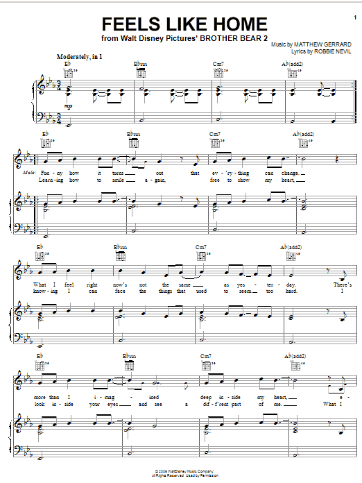 Download or print Melissa Etheridge Feels Like Home sheet music, chords and digital score arranged for Piano, Vocal & Guitar Chords (Right-Hand Melody). This Children score includes 7 page(s).