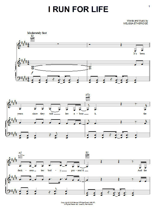 Download or print Melissa Etheridge I Run For Life sheet music, chords and digital score arranged for Piano, Vocal & Guitar Chords (Right-Hand Melody). This Pop score includes 10 page(s).