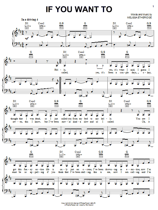 Download or print Melissa Etheridge If You Want To sheet music, chords and digital score arranged for Piano, Vocal & Guitar Chords (Right-Hand Melody). This Pop score includes 6 page(s).