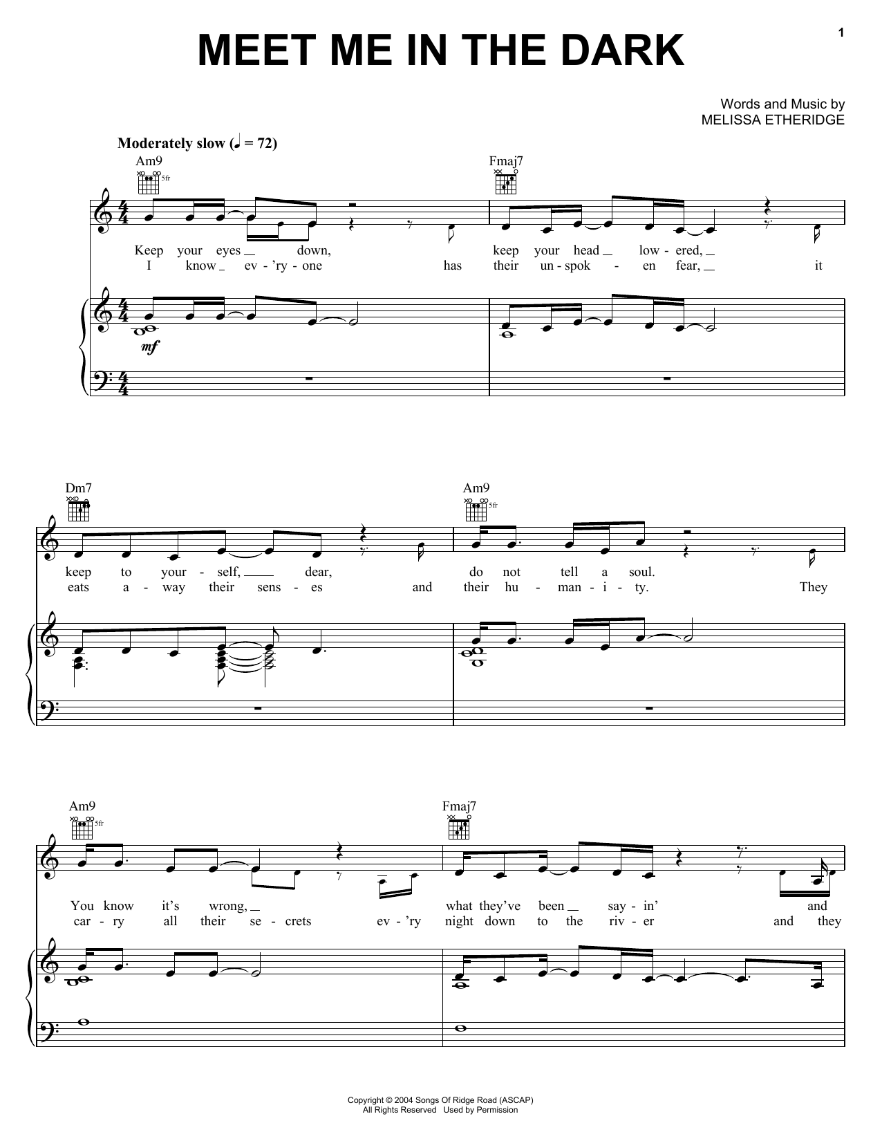 Download or print Melissa Etheridge Meet Me In The Dark sheet music, chords and digital score arranged for Piano, Vocal & Guitar Chords (Right-Hand Melody). This Pop score includes 6 page(s).