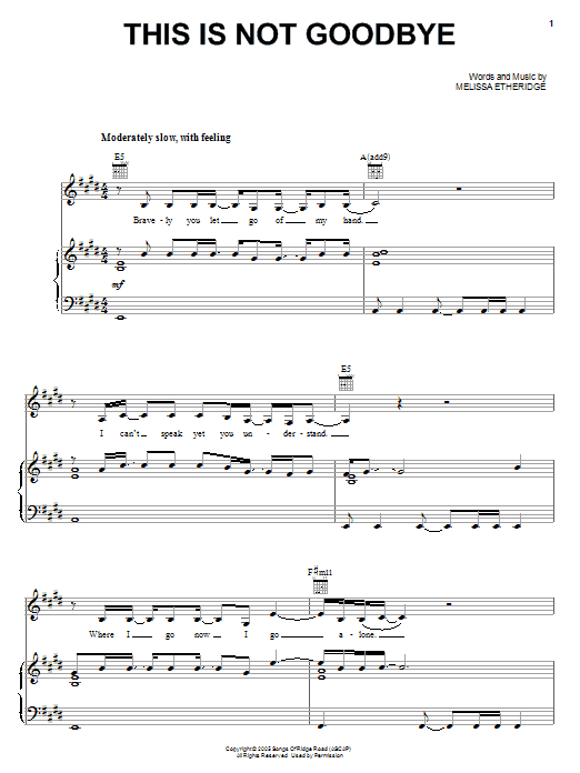 Download or print Melissa Etheridge This Is Not Goodbye sheet music, chords and digital score arranged for Piano, Vocal & Guitar Chords (Right-Hand Melody). This Pop score includes 7 page(s).