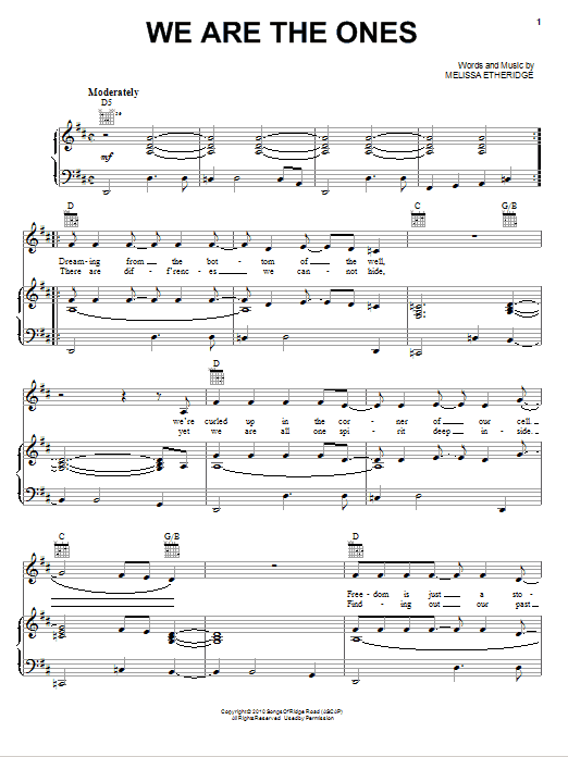Download or print Melissa Etheridge We Are The Ones sheet music, chords and digital score arranged for Piano, Vocal & Guitar Chords (Right-Hand Melody). This Pop score includes 10 page(s).